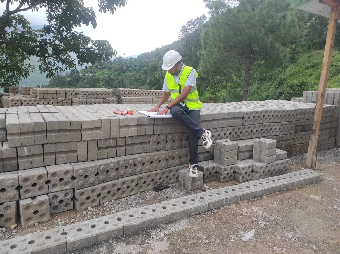 Project Engineer Satya with the cured Compressed Stabilised Earth Bricks (CSEB).